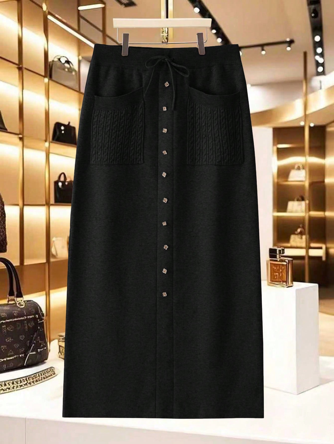 تنورة صوف تجمع بين الأناقة والدفء مع تصميم عصري مزين بالراين ستون والترتر، ليمنحك إطلالة أنثوية مميزة ومتلألئة في كل مناسبة. قصّة نحيلة وعصرية مع جيوب عملية تضيف لمسة كاجوال راقية، مثالية للاستخدام اليومي أو المناسبات الخاصة خلال موسم الخريف والشتاء.